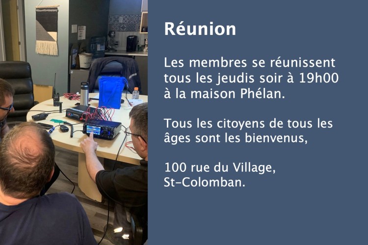 We are pleased to invite you to our next meeting. It will be held at Maison Phélan, located at 100 rue du Village, St-Colomban, every Thursday at 19:00.